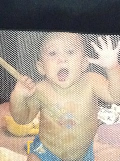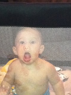 Jakey turns 9 months old today! Amazing the things we can teach our babies at such an early age! Like numbers, ABC’s, and making mushy faces on the playpen mesh! I wish I could have handed the camera to Jake to snap a pic of me when I was teaching him how to mushy!