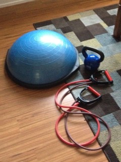 A Bosu ball, a kettle bell, and some resistance bands. That’s it. You can target every major muscle group with these few items. These take care of the strength building, but how do you get your cardio in? That’s where the fun begins. It’s a matter of compiling a short list of exercises, and doing them as quickly and safely as you can to increase your heart rate. Do two or three “sets” of those exercises with very little rest, and you’ve got a workout that will kick your ass, guaranteed!